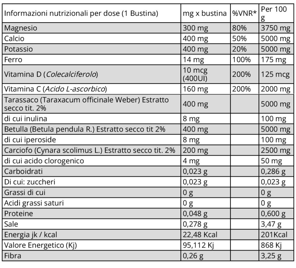 DESCRIZIONE Snep RealComplex è un integratore alimentare che può essere utile per favorire la purificazione dell'organismo attraverso il fegato ed i reni. Il Tarassaco favorisce la detossificazione attraverso il fegato di sostanze e metaboliti tossici accumulati nel nostro organismo. La Betulla può favorire la diuresi, attività attribuita al contenuto di flavonoidi; può essere anche utile per prevenire la calcolosi renale e la renella. Il Carciofo può promuovere una azione coleretica per la presenza di cinarina, sostanza amara che stimola la secrezione della bile; altre funzioni imputabili a questa pianta sono quella eupeptica e stomachica. Snep Real Complex ha nella sua formula anche dei Sali minerali, fra cui Ferro Bisglicinato: è costituito da una molecola di ferro ferroso legata a due molecole di glicina. Questo composto contenente ferro risulta essere ben tollerato e ben assorbito dal sistema gastrointestinale. La Vit.C è un importante antiossidante che può contrastare l'azione dei radicali liberi, quindi può essere un aiuto per l'organismo contro gli agenti inquinanti, gli effetti del fumo e l'invecchiamento dei tessuti; è anche importante per l'assorbimento e l'utilizzo del ferro. Il Magnesio citrato può essere utile per il rilassamento della muscolatura, il citrato può sostenere l'organismo nelle situazioni di stanchezza e può contrastare, come la betulla, l'insorgenza di alcuni tipi di calcoli renali. Il Calcio carbonato può avere funzione importante per le ossa insieme alla vitamina D, ed azione lenitiva per l'acidità gastrica. Snep Real Complex con i suoi componenti può rappresentare un valido aiuto per depurare l'organismo, per proteggerlo contro i radicali liberi e mantenere un fisiologico benessere. INDICAZIONI Realcomplex è un integratore alimentare di minerali (Magnesio, Potassio, Calcio, Ferro), Vitamine C e D, con estratti di Tarassaco, Betulla e Carciofo. INGREDIENTI Magnesio citrato; Potassio citrato; Calcio fosfato; Acidificanti (Acido tartarico; Acidocitrico); Correttore di acidità (Sodio bicarbonato); Tarassaco (Taraxacum officinaleWeber) radice Estratto secco tit. 2% in inulina; Betulla (Betula pendula R.) foglieEstratto secco tit. 2% in iperoside; Inulina; Carciofo (Cynara scolymus L.) foglieEstratto secco tit. 2,5% in acido clorogenico; Vitamina C (Acido L-ascorbico); Aromaarancio; Ferro bisglicinato; Edulcorante (Sucralosio); Vitamina D (Colecalciferolo) MODALITÀ D'USO 1 bustina al giorno diluita in acqua; non superare la dose giornaliera consigliata. CONFEZIONE 30 bustine 8 g. CONSERVAZIONE Conservare in luogo fresco e asciutto, dopo l’apertura il prodotto teme l’umidità,mantenere ben chiuso. La data di scadenza si riferisce al prodotto in confezionamento integro, correttamente conservato. VALORI NUTRIZIONALIAVVERTENZE Gli integratori non vanno intesi come sostituti di una dieta variata ed equilibrata e diuno stile di vita sano. Tenere fuori dalla portata dei bambini al di sotto dei tre anni. Senza glutine.