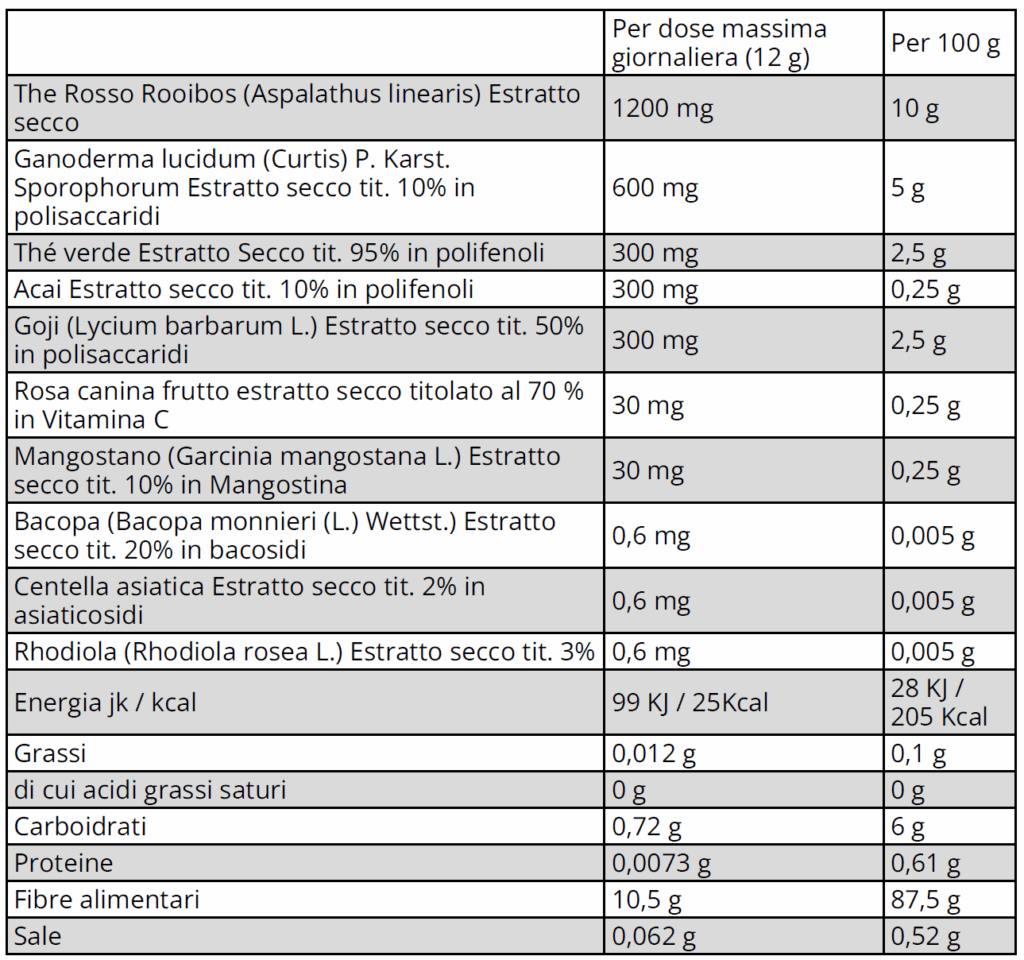 DESCRIZIONE Disintossicare l'organismo ha effetti benefici anche sul metabolismo e sulla ritenzione di liquidi corporei. Purificare il nostro corpo influisce quindi anche sulla nostra bellezza. La ritenzione idrica è la tendenza da parte dell'organismo a trattenere liquidi, che ristagnano generalmente nelle zone predisposte all'accumulo di grasso (addome, cosce e glutei), provoca un rigonfi amento dei tessuti (edema) dovuto all'accumulo di liquidi nei quali ritroviamo numerose tossine. Le cause del ristagno di liquidi e produzione di tossine possono essere molteplici, fra cui lo stress che sbilancia la produzione di ormoni, problemi alla circolazione venosa, all'inquinamento prodotto dalla moderna società e non per ultima ad una scorretta alimentazione. SNEP THE MIX ha un effetto drenante ed antiossidante dovuto ai suoi numerosi componenti naturali che con azione sinergica aiutano a drenare i liquidi in eccesso ed eliminare le tossine e a ripristinare un corretto equilibrio metabolico. SNEP THE MIX può aiutare la funzionalità della circolazione venosa , del microcircolo ed il drenaggio dei liquidi corporei. Gli antiossidanti contenuti in SNEP THE MIX possono aiutare fegato e reni a smaltire le tossine presenti nei liquidi. SNEP THE MIX abbinato ad un uno stile di vita sano, non sedentario e ad una dieta ricca di fibre aiuta a prevenire e risolvere la ritenzione idrica ed i connessi problemi metabolici ed estetici. SNEP THE MIX contiene sostanze naturali di CERTIFICATA qualità. The rosso: antiossidante eliminazione dei gas intestinali The verde: drenaggio dei liquidi corporei, Equilibrio del peso corporeo, Normale funzionalità intestinale, Tonico (stanchezza fi sica, mentale), Antiossidante Ganoderma: naturali difese dell'organismo Acai: Antiossidante. Metabolismo dei lipidi e dei carboidrati. Regolarità del transito intestinale. Goji: Antiossidante. Rosa Canina: Azione di sostegno e ricostituente. Regolarità del transito intestinale. Antiossidante. Mangostano: Antiossidante. Naturali difese dell'organismo. Bacopa: Memoria e funzioni cognitive. Rilassamento (sonno), benessere mentale. Centella Asiatica: Contrasto degli inestetismi della cellulite. Funzionalità del microcircolo (pesantezza delle gambe). Memoria e funzioni cognitive Rhodiola: Tonico-adattogeno. Tonico (stanchezza fi sica, mentale). Normale tonodell'umore. INDICAZIONI Snep The Mix è un integratore alimentare a base di The rosso Rooibos, The Verde, Ganoderma, Acai, Goji, Mangostano, Rosa canina, Bacopa, Centella e Rhodiola. INGREDIENTI Agente di carica (Inulina); The rosso Rooibos (Aspalathus linearis (Burm. f.) R.Dahlgren) foglie ES; Ganoderma lucidum (Curtis) P. Karst. Sporophorum Estrattosecco tit. 10% in polisaccaridi; Thé verde (Camellia sinensis (L.) Kuntze) foglie Estrattosecco tit. 95% in polifenoli; Açai (Euterpe oleracea Mart.) frutto Estratto secco tit. 10%polifenoli; Goji (Lycium barbarum L.) frutto Estratto secco tit. 50% polisaccaridi;Acidifi cante (Acido citrico); Rosa canina frutto estratto secco titolato al 70 % inVitamina C; Mangostano (Garcinia mangostana L.) polpa del frutto Estratto secco tit.10% in mangostina; Agente antiagglomerante (Biossido di silicio); Aroma Frutti Rossi;Bacopa monnieri (L.) Pennel parte aerea Estratto secco tit. 20% in bacosidi; Centellaasiatica (L.) Urb. parte aerea Estratto secco tit. 2% in asiaticoside; Rhodiola rosea L.radici Estratto secco tit. 1% in salidroside MODALITÀ D'USO La confezione include un misurino graduato a 2g, 3g e 5g, che rende ancora più faciledosare la quantità di prodotto in base alle proprie preferenze. Questo permette discegliere la quantità, sia per una singola porzione di 250ml (2g), sia per una bevandapiù concentrata o un'intera bottiglia. Conservare in frigo e consumare entro 24 ore dalla preparazione. Non superare la dose giornaliera raccomandata. CONFEZIONE 120 gr CONSERVAZIONE Conservare in luogo fresco e asciutto, dopo l’apertura il prodotto teme l’umidità,mantenere ben chiuso. La data di scadenza si riferisce al prodotto in confezionamento integro, correttamente conservato. VALORI NUTRIZIONALIAVVERTENZE Gli integratori non vanno intesi come sostituti di una dieta variata ed equilibrata e di uno stile di vita sano. Tenere fuori dalla portata dei bambini. Il prodotto deve essere impiegato nell’ambito di una dieta ipocalorica adeguata, seguendo uno stile di vita sano con un buon livello di attività fi sica.